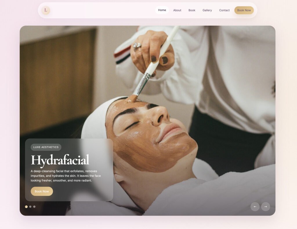 View case studyA premium one-page beauty and aesthetics website concept designed to showcase treatments, strengthen brand presentation and streamline bookings through a custom backend booking plugin.